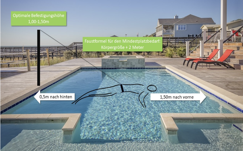- Aktiv Schwimmen: 4x 2m , 3 x 4 m. Pro-Tipp: In kleinen Pools ist ein Schwimmtrainer (Gegenstromanlage) Pflicht, damit du nicht nach zwei Zügen wenden musst.